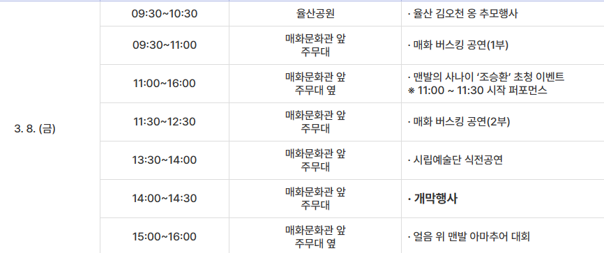 3월 8일에는 버스킹공연1,2부와 오후 2시부터 개막행사를 시작하고 특히 오전 11시부터 매화문화관 앞 주무대 옆에서 맨발의 사나이 '조승환'님의 초청 이벤트가 있다고 합니다.