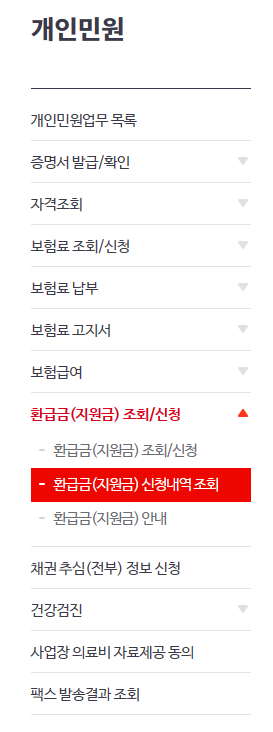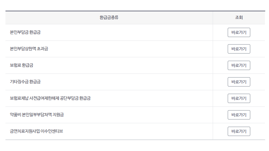 환급금(지원금) 신청내역 조회를 통해서 본인부담금 환급금 조회/신청뿐만 아니라 본인부담상한액 초과금, 보험료 환급금, 기타 징수금 환급금, 보험료체납 사전급여제한해제 공단부담금 환급금, 약품비 본인일부부담차액 지원금, 금연치료지원사업 이수인센티브를 조회할 수 있습니다.