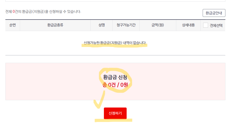 0원으로 뜨지만 만약 환급금 신청내역이 있다면 바로 밑에 신청하기를 누르세요.