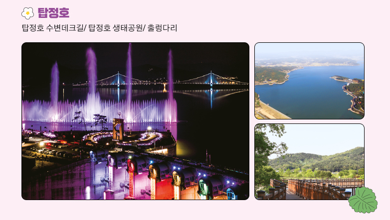 탑정호에는 아주 긴 출렁다리가 있습니다. 이곳은 특히 여름이라면 뜨거운 여름을 시원하게 보낼 수 있는 장소로도 추천드립니다. 딸기축제를 즐기시고 시간이 여유롭다면 한번쯤 들려서 가족들과 좋은 시간 보내는 것을 추천드립니다