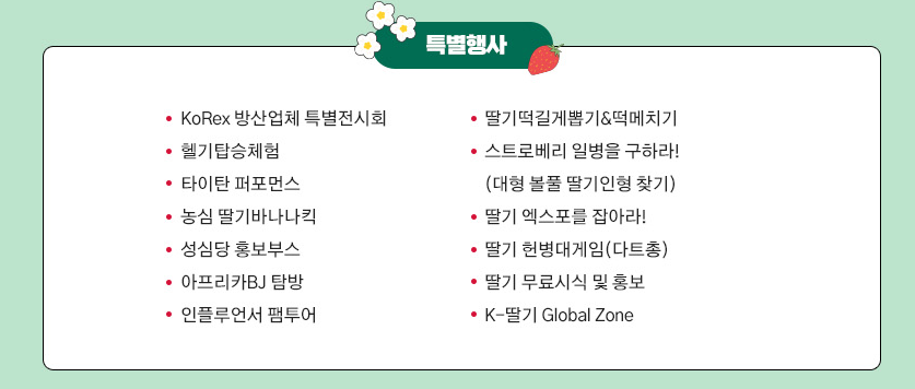 K-딸기 전국가요제, 댄스경연대회와 딸기를 주제로 한 디저트 경연대회 그리고 버스킹공연과 불꽃놀이 레이저쇼 EDM 파티등 재밌게 즐길 수 있는 요소가 많은 것 같습니다.