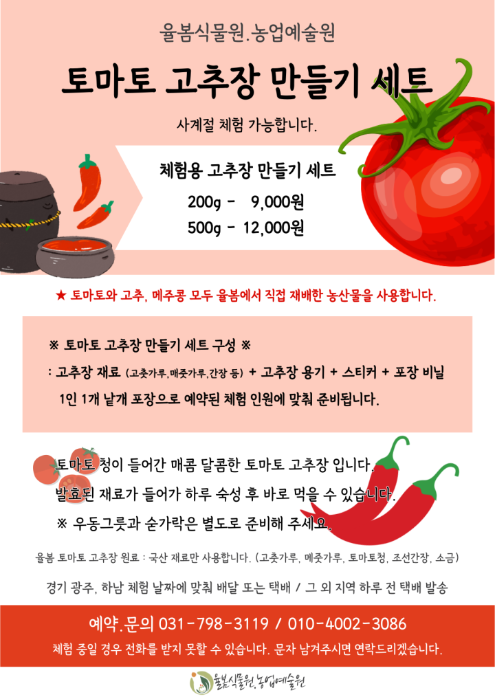 토마토 고추장 만들기 세트(체험키트)도 판매한다고 하니 홈페이지 방문하셔서 참고하시면 되겠습니다.