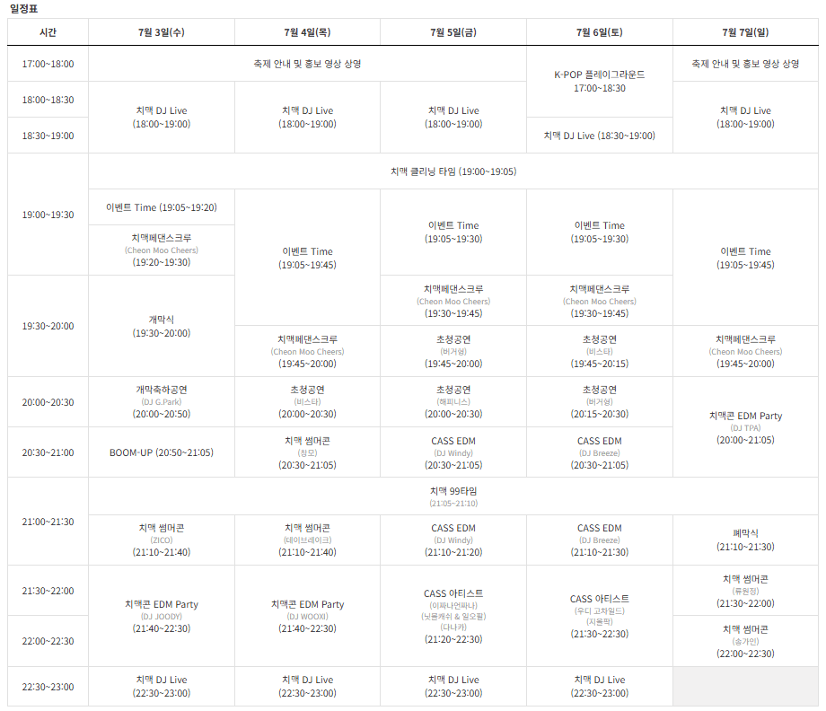 2024년 7월 3일부터 7일까지 진행되는 치맥페스티벌은 사전예약을 통해 프리미엄존에서 축제를 즐길 수 있다고 합니다.