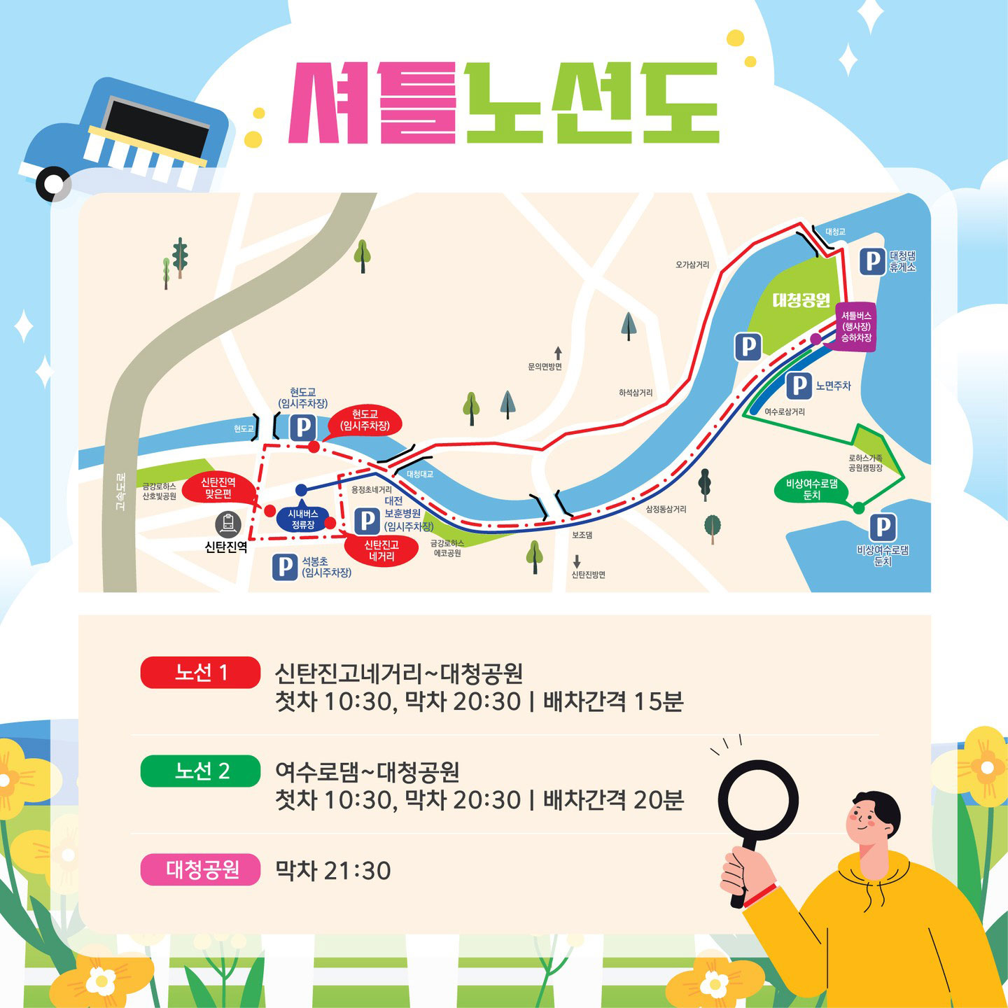 노선2는 비상여수로댐둔치(임시주차장)-대청공원 으로 이루어지니 임시주차장에 주차하신분들도 이용하시면 편하실것 같습니다.