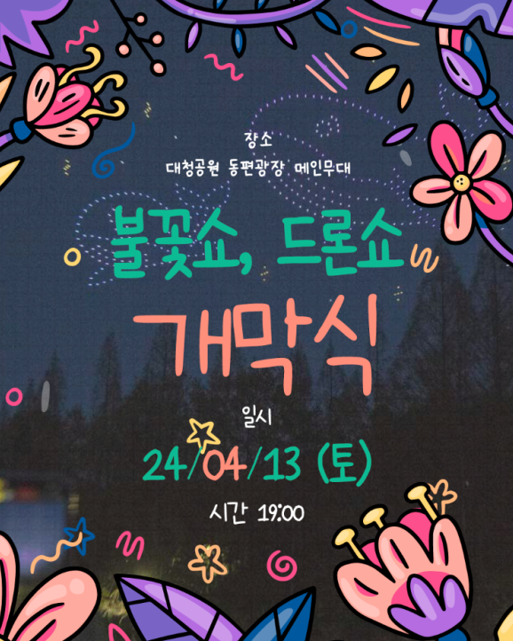 개막식은 4월 13일 토요일 저녁 7시, 대청공원 동편 잔디광장 메인 무대에서 불꽃쇼와 드론쇼가 펼쳐진다고 합니다.