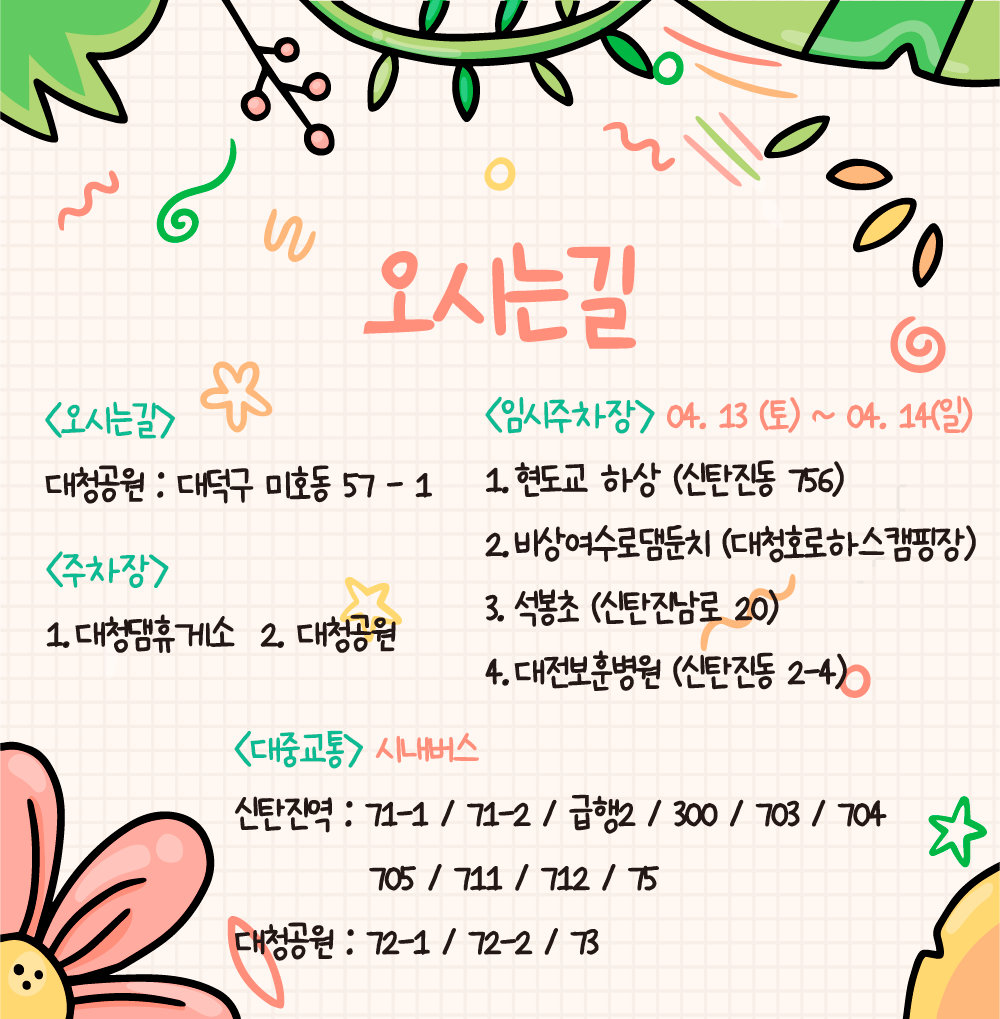 특히 13일과 14일 많은 분들이 방문하실것을 대비하여 현도교 하상과 비상여수로댐둔치, 석봉초, 대전보훈병원에 임시주차장을 마련했으니 이용해주시기 바랍니다.