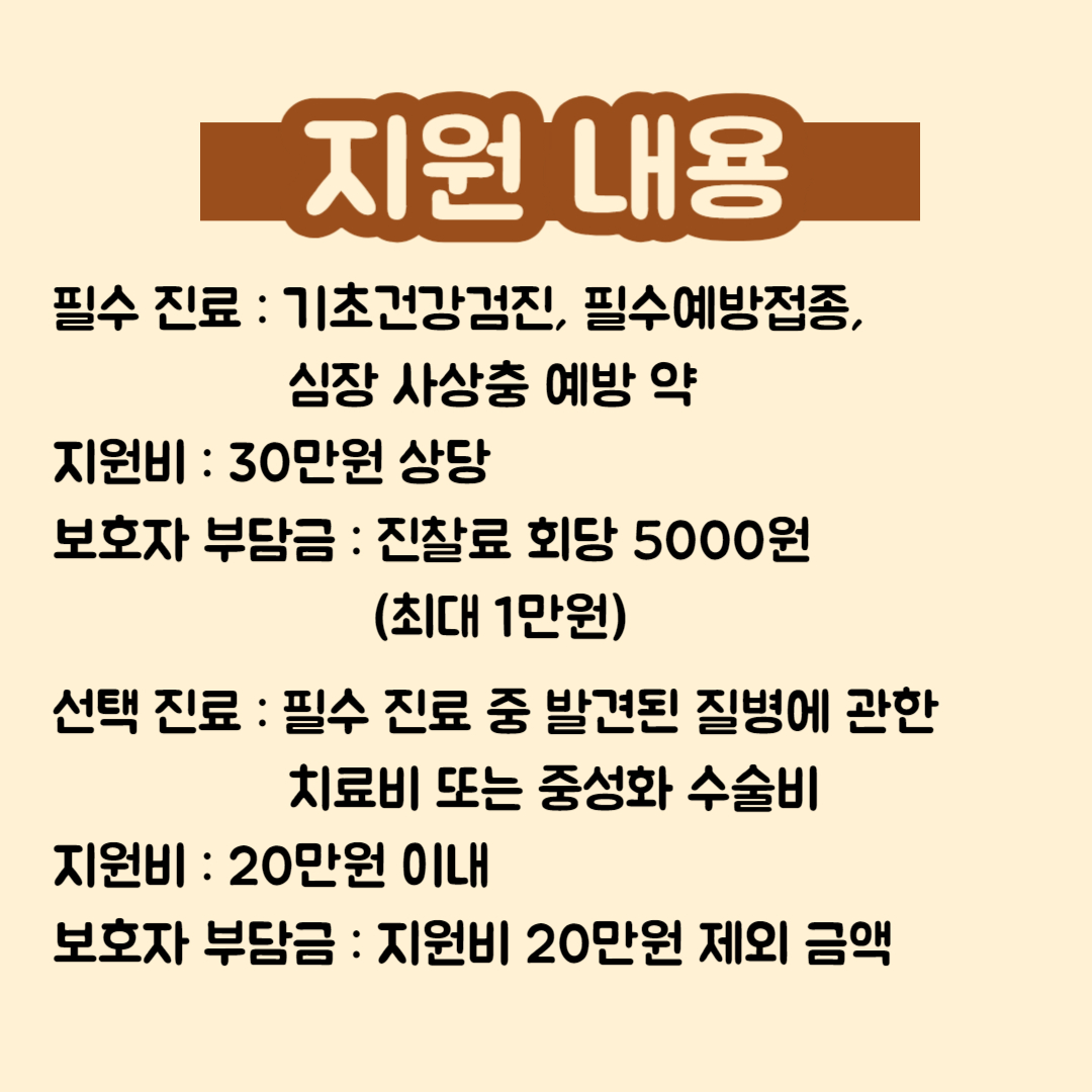 1년에 1회 가구당 2마리까지 지원, 주소지 관할 자치구에서 지정한 우리동네 동물병원에서 신청가능