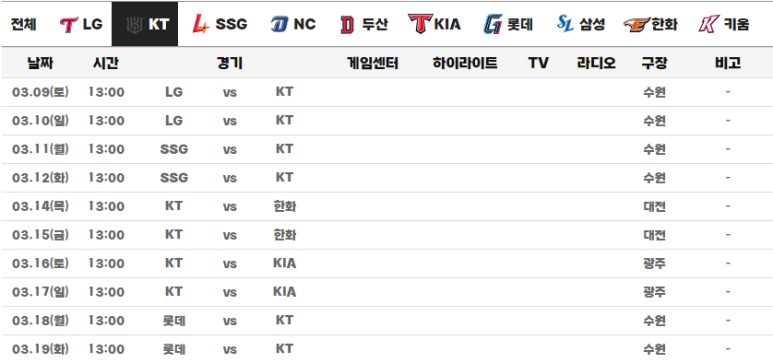 장소: 경기 수원시 장안구 경수대로 893 수원종합운동장(주 경기장) 수원 KT위즈파크