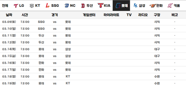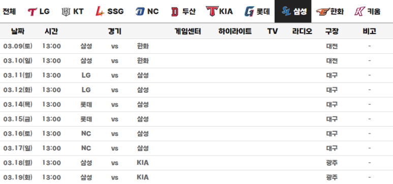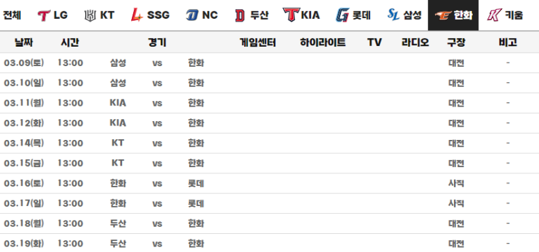 대전 홈 경기 : 3월 9일, 10일, 11일, 12일, 14일, 15일, 18일, 19일