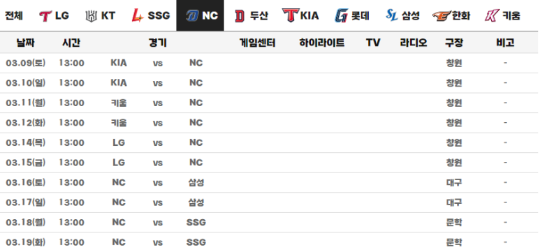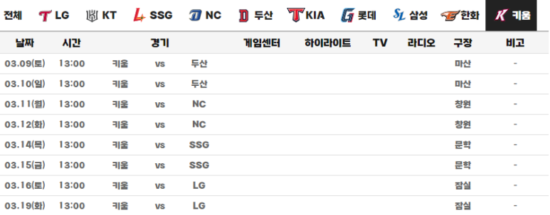 장소: 마산, 창원, 문학, 잠실 ( 홈 그라운드 공사 3월 9일~19일)