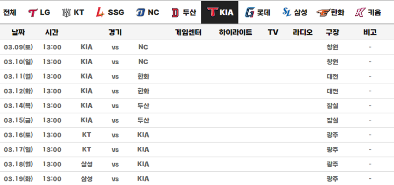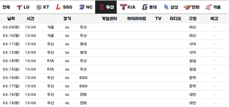 시범경기 개막전은 수원, 대전, 사직, 창원, 마산 구장에서 시작됩니다. 이번 경기 일정은 구단별 이동거리와 그라운드 공사등으로 사용이 불가한 구장을 고려해 편성했으며 마산 구장을 중립구장으로 두었다고 합니다.