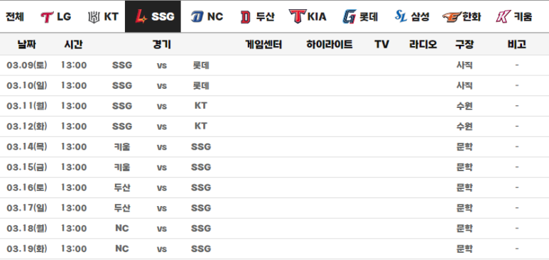 문학 홈경기 : 3월 14일, 15일, 16일, 17일, 18일, 19일