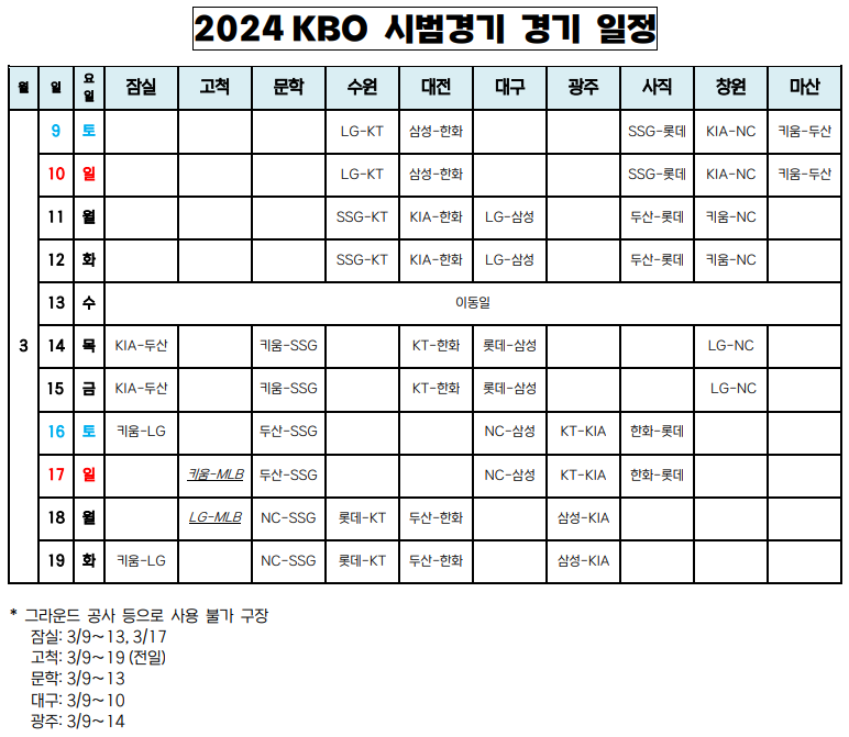 2024년 한국야구 시범경기 일정에 대해 알아보겠습니다.